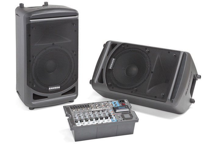 ALTAVOZ CON BATERÍA RECARGABLE Equipo portátil compuesto por 2 cajas de 10''+1'' y mezclador con etapa de potencia incorporada de 2 x 500W. La máxima potencia en un equipo compacto portátil. Polivalente: eventos al aire libre, teatros, salas de conferencia, etc. El mezclador incorpora diez canales: 4 canales micro/línea y 3 canales estéreo, incorpora unidad de efectos y conexión Bluetooth así como USB para sistema de microfonia inalámbrica Samson XPD1.