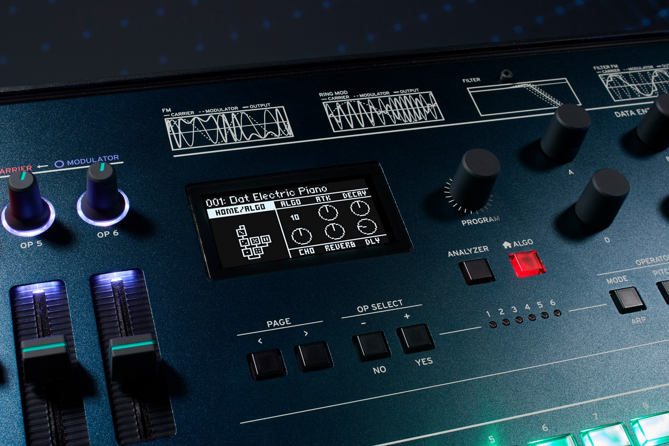 - Algoritmos y modos de operador: 40 algoritmos predefinidos más modo de usuario. El operador ofrece 5 modos: FM, Ring Mod, Filter, Filter FM y Wave Folder.