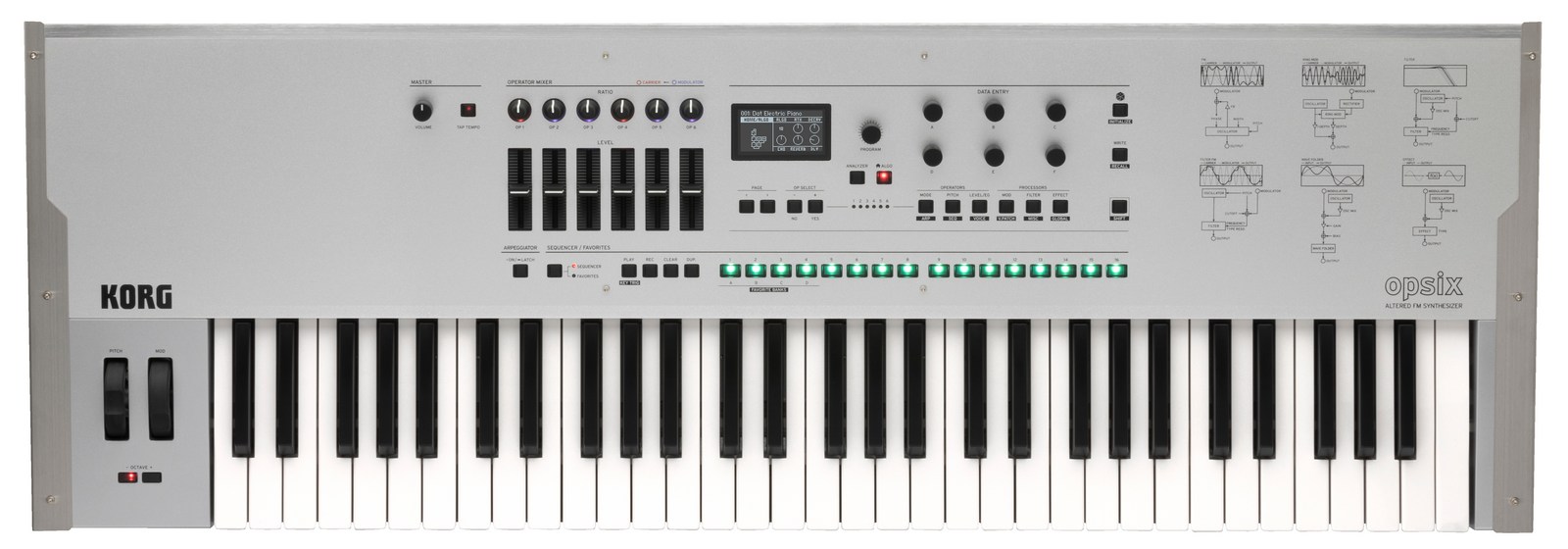 TECLADO SINTETIZADOR PROFESIONAL Versión especial de edición limitada. opsix SE Platinum es un sintetizador digital como ningún otro. Con un diseño premium totalmente metálico, 61 teclas y Aftertouch, abre un nuevo mundo de posibilidades sonoras. Basado en el motor de sonido expansivo del opsix original, el opsix SE lo mejora con una mayor polifonía y voicing, dando como resultado un sintetizador creado para un rendimiento superior y un control preciso.El mezclador de operadores de opsix simplificó por primera vez la síntesis FM, haciéndola no sólo comprensible, sino también controlable. Con la adición de funciones de síntesis y programación adicionales, ofrecía un flujo de trabajo más eficaz y un sonido aún más rico.El opsix SE lleva esto aún más lejos. Está equipado con el teclado premium Korg de 61 teclas de tacto natural, complementado con Aftertouch, que proporciona la excepcional experiencia táctil que se espera de los Workstations emblemáticos de Korg. Con un cuerpo metálico elegante y robusto, está construido tanto para la intensidad de los conciertos en directo como para la precisión de las sesiones de Estudio. Los mandos metálicos tienen un peso óptimo para realizar ajustes sin esfuerzo. Bajo su exterior, la opsix SE dispone de una increíble capacidad de 80 voces estéreo de polifonía.El opsix SE viene precargado con cientos de sonidos mejorados para el control Aftertouch. Además, es totalmente compatible con los sonidos y muestras tanto del opsix original como del software opsix Native, incluyendo numerosas librerías de alta calidad.Características principales:Edición especial limitada Platinum en color plateado>-Teclado de 61 teclas Natural Touch sensible a la velocidad y a la velocidad de liberación, Aftertouch-Generador de sonido FM alterado-Polifonía máxima 80 voces-Estructura: 6 operadores, 1 filtr, 3 Egs, 3 LFOs, 3 efectos, secuenciador por pasos, arpegiador-40 Algoritmos, más algoritmo de usuario único para cada programa-6 modos de operador (FM, Mod. anillo, Filtro, Filtro FM, Wave Folder, Efecto)-500 Programas (350 presets y 150 de usuario)-Compatible con software Librarian gratuito-Dimensiones: 1.014 x 344 x 108 mm-Peso: 8,6 kg.-Elementos incluidos: Adaptador de corriente, estuche rígido, set de adhesivos, camiseta exclusiva