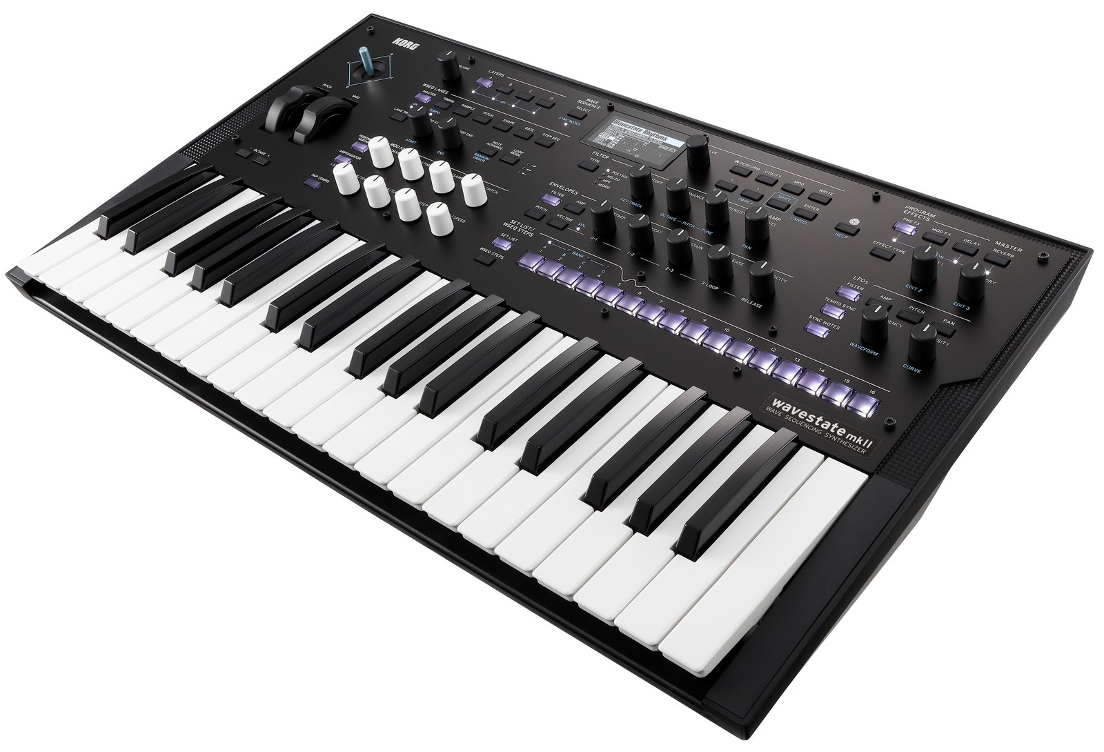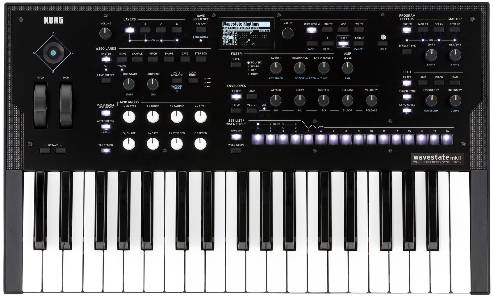 El sintetizador de 37 teclas de la serie Korg, denominado `Wavestate MKII`, ofrece un motor de síntesis **Wave Sequencing 2.0** completamente rediseñado para generar sonidos dinámicos y cambiantes, adecuado tanto para estudio como para directo.