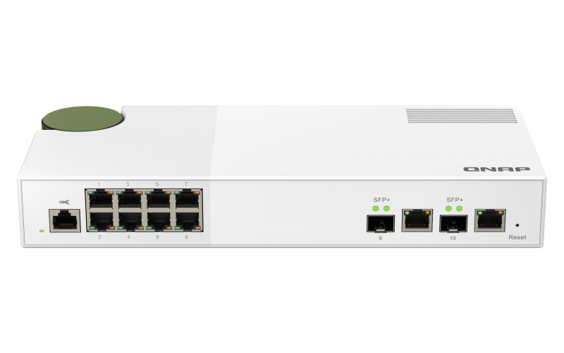 QSW-M2108-2C Switch 10GbE – 10 puertos (8 RJ45, 2 combo SFP+/RJ45), agregación de puertos 802.3ad. El QSW-M2108-2C es un Switch Gestionable por web de Capa 2 que cuenta con dos puertos combinados SFP+/RJ45 10GbE y ocho puertos de 2,5 Gigabit. Admite conmutación de Capa 2 y gestión de red a través de una interfaz de usuario web fácil de usar. Es compatible con las tecnologías 10GbE y NBASE-T, por lo que admite hasta cinco velocidades (10G / 5G / 2,5G / 1G / 100M) con el fin de suministrar velocidades de transmisión más altas con los cables de Cat 5e y 6a existentes.