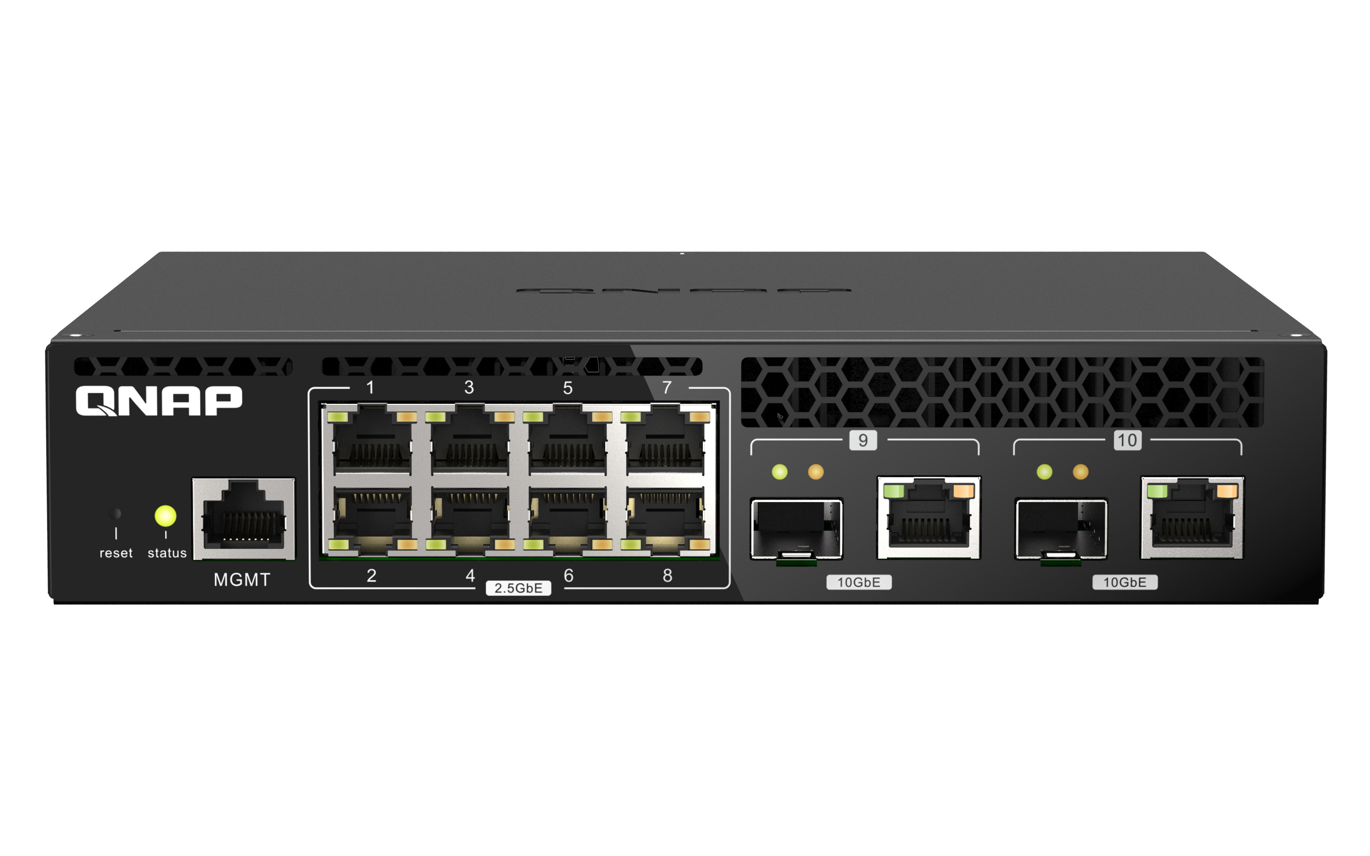QSW-M2108R-2C Switch rack 10GbE – 10 puertos (8 RJ45, 2 RJ45/SFP+), agregación de puertos 802.3ad El QSW-M2108-2C es un switch gestionable que cuenta con dos puertos combinados SFP+/RJ45 10GbE y ocho puertos de 2,5 Gigabit. Ofrece una implementación flexible en entornos de red híbrida de alta velocidad y es compatible con las tecnologías 10GbE y NBASE-T, por lo que admite hasta cinco velocidades (10G / 5G / 2,5G / 1G / 100M).